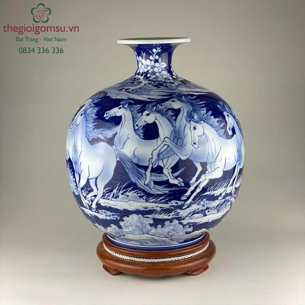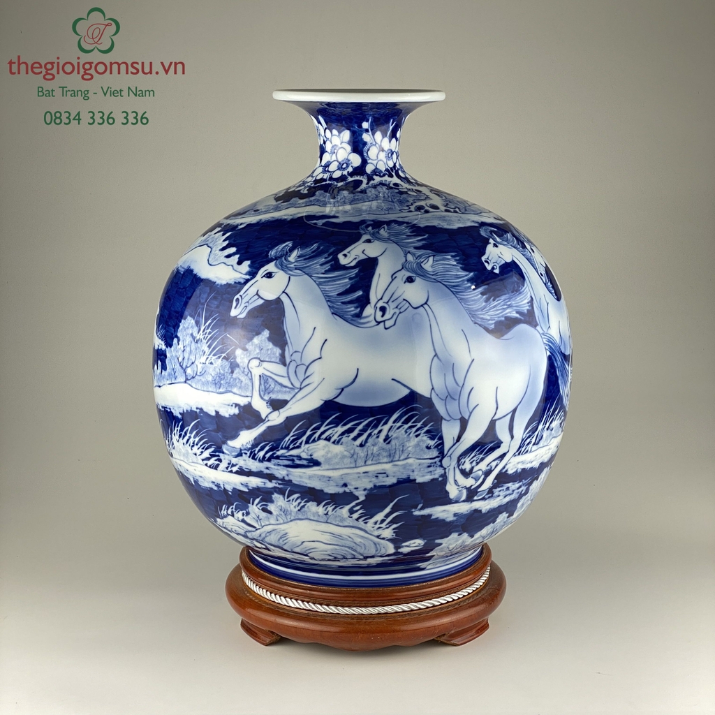 - Quy trình chế tác: Bình hút tài lộc Bát mã truy phong men lam chế tác 100% thủ công theo bí quyết “nhất xương, nhì da, thứ ba dạc lò” của làng nghề. Từ đất cao lanh hiếm có của Đông Triều - với độ dẻo, quánh và phẩm chất cao - nghệ nhân nhào trộn cùng nước phù sa sông Hồng tạo thành xương gốm tốt nhất. Trải qua nung đốt liên tục 12 giờ ở 1350 độ C, lớp men lam nóng chảy thành những nét hoa văn đậm nhạt tinh tế. Sản phẩm đạt độ bền cao trọn đời.