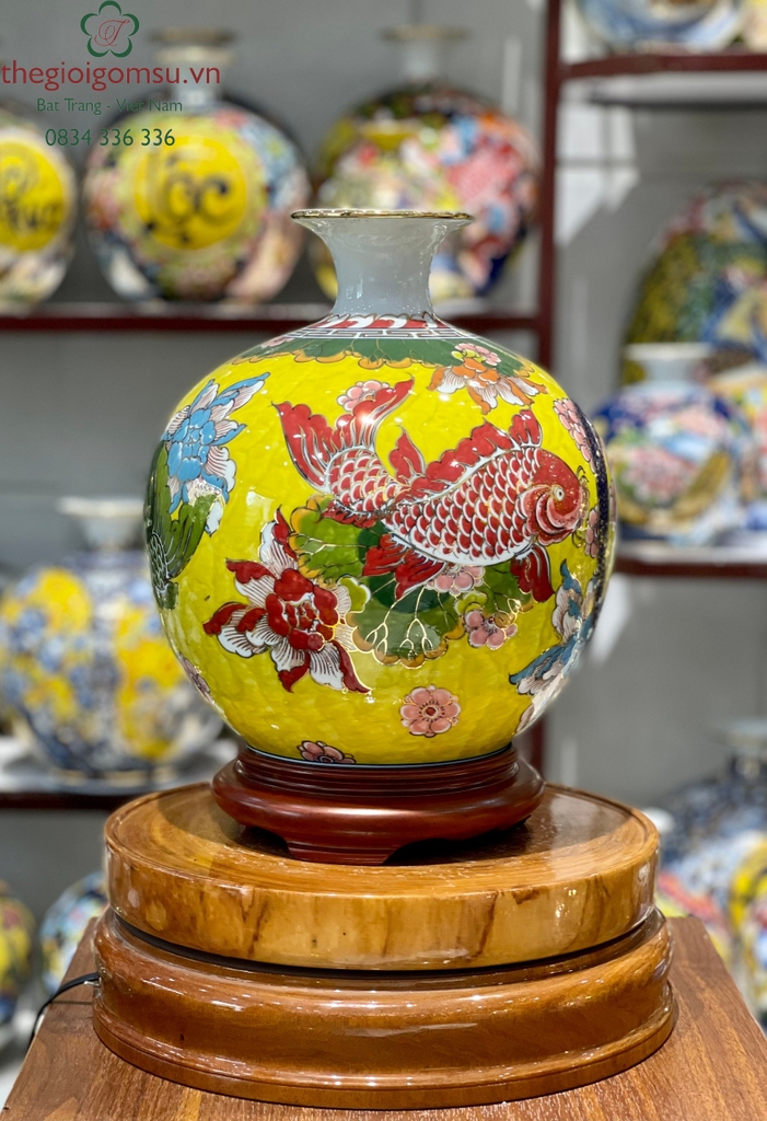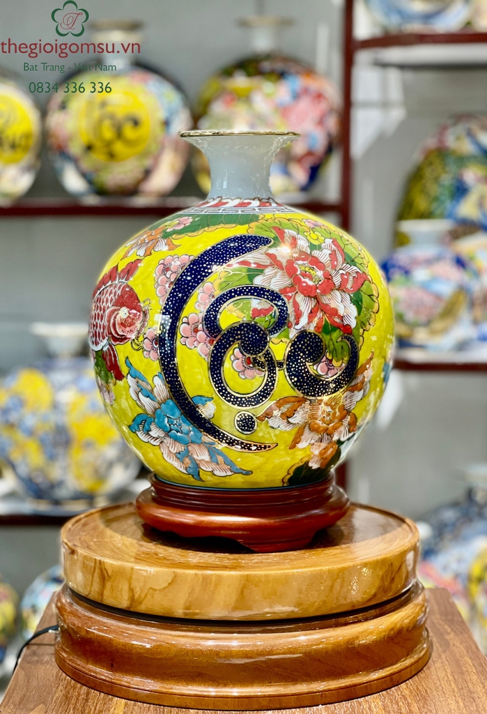 - Chất liệu: Bình hút tài lộc vẽ vàng 24k được tạo thành từ đất mẹ Đông Triều hòa cùng mạch nước thiêng sông Hồng cho cốt gốm dày dặn, cầm chắc tay, độ bền vượt trội.