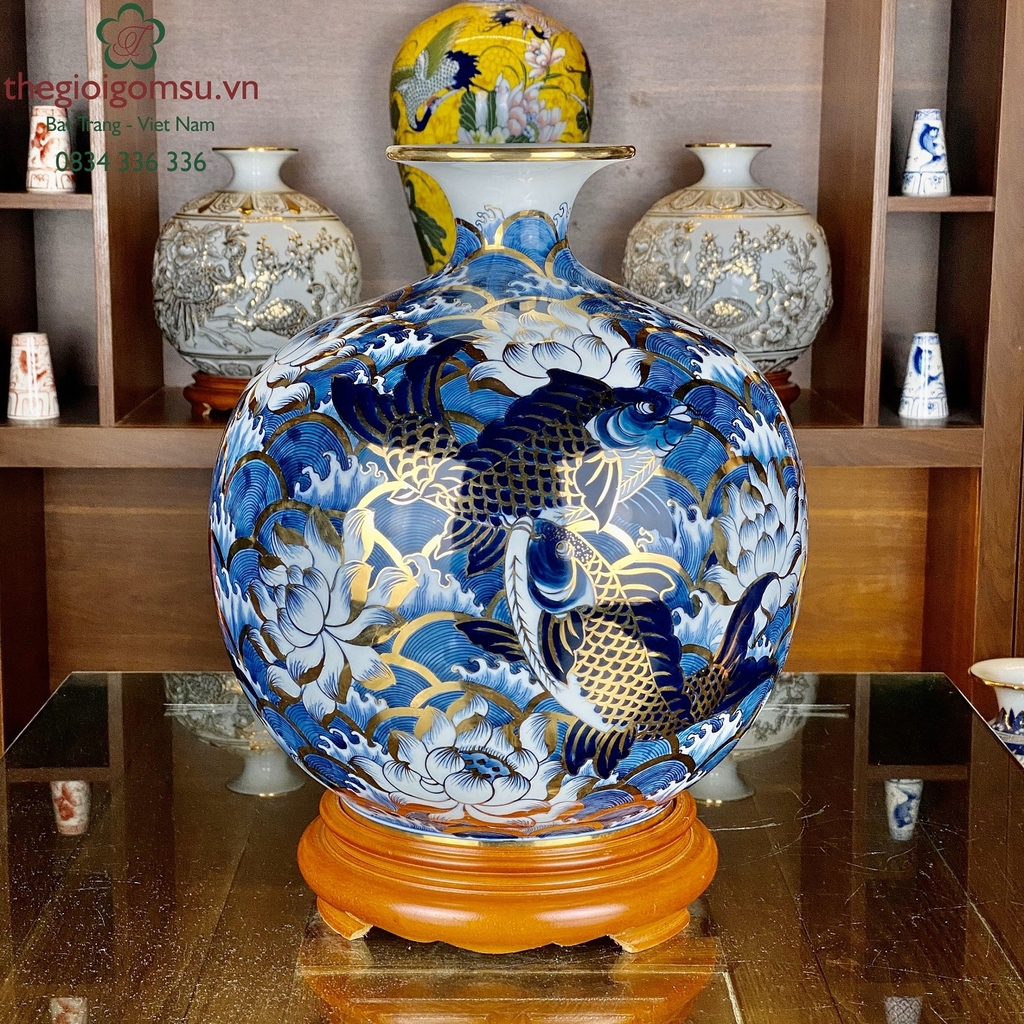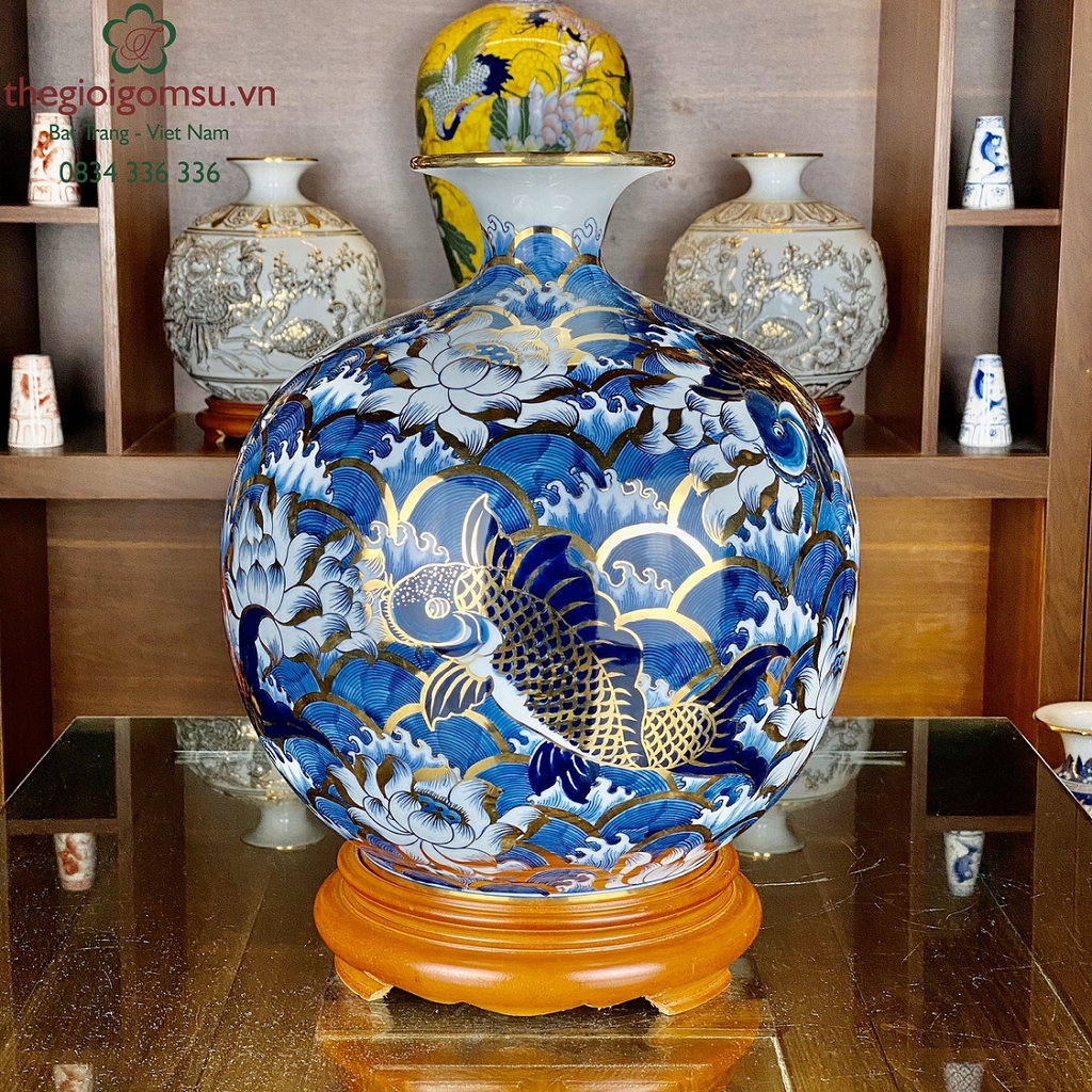 Bình hút tài lộc Bát Tràng vẽ cá chép liên hoa bơi trên sóng được làm thủ công hoàn toàn. Với họa tiết tinh tế, được vẽ tay bởi các nghệ nhận 100%. Mang đến sự mềm mại, hoàn hảo và lôi cuốn ở mọi góc độ. Với màu sắc tươi sáng bình hứa hẹn sẽ mang đến sự mới mẻ, sức sống căng tràn cho không gian trưng bày của gia đình. Ngoài ra, theo phong thủy bình còn mang ý nghĩa tượng trưng cho sự no đủ, dư giả về vật chất, cho sự sinh sôi nảy nở. Bình còn là một món quà vô cùng ý nghĩa mà bạn có thể gửi tặng cho người thân, bạn bè, đối tác, sếp vào các dịp lễ tết quan trọng.Hình ảnh cá chép bơi trên những con sóng lớn cho thấy ý trí và nghị lực phi thường.