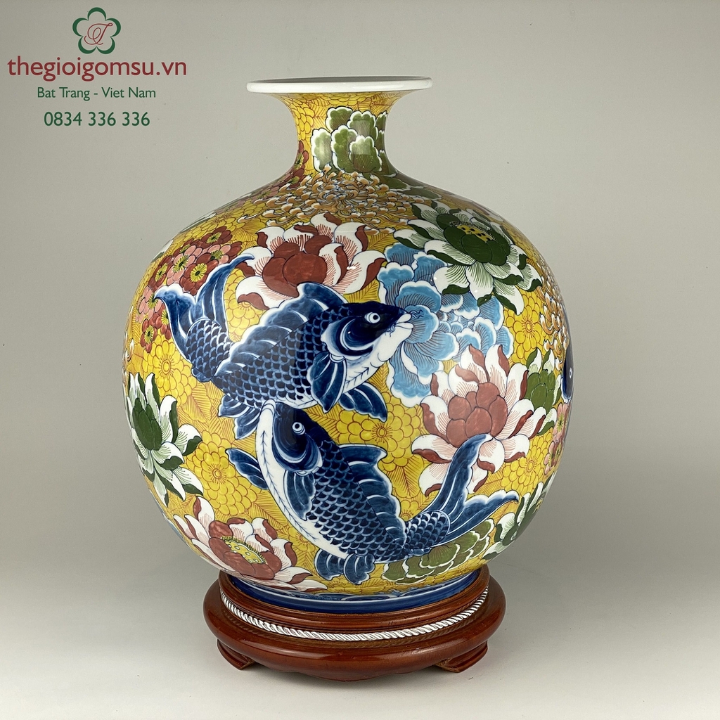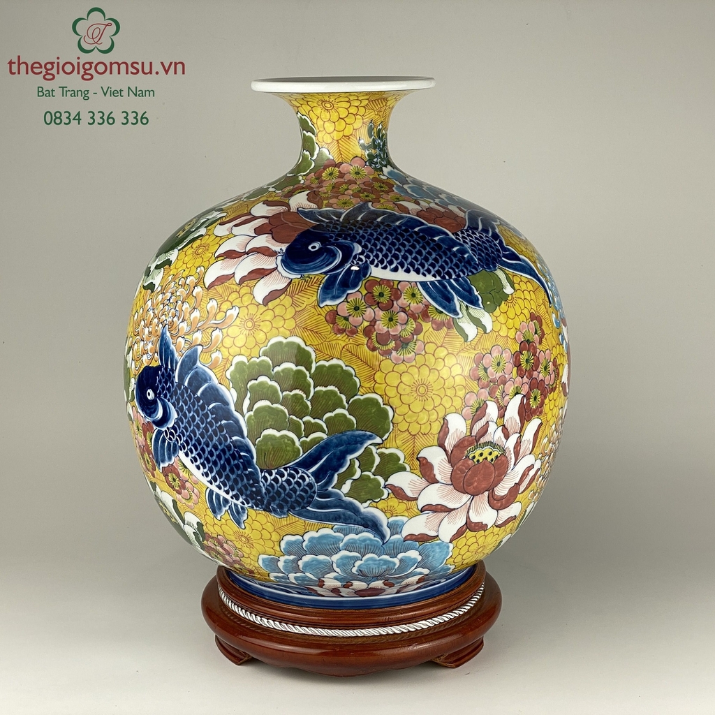 Bình hút tài lộc "Cá chép vẽ hoa" nền cổ vàng đại cát