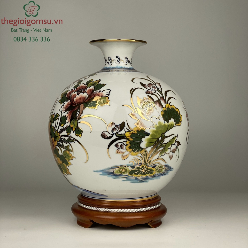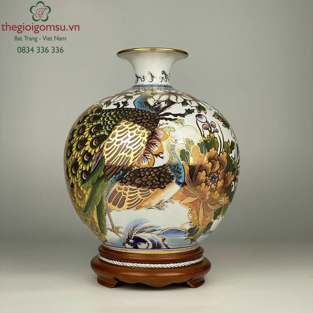 - Quy trình chế tác: Sản phẩm được chế tác thủ công 100% bởi bàn tay người nghệ nhân giỏi Bát Tràng. Trải qua lần nung đầu tiên ở nhiệt độ 1350 độ C và lần nung tiếp theo ở nhiệt độ 800 độ C để lớp vàng kim nóng chảy và bám chặt vào bề mặt sứ tạo nên vẻ đẹp sang quý, đẳng cấp.