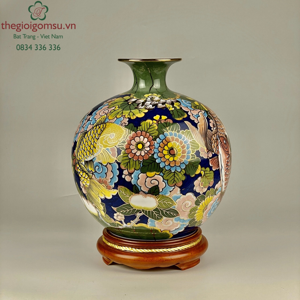 - Quy trình chế tác: Sản phẩm được chế tác thủ công 100% bởi bàn tay người nghệ nhân giỏi Bát Tràng. Trải qua lần nung đầu tiên ở nhiệt độ 1350 độ C và lần nung tiếp theo ở nhiệt độ 800 độ C để lớp vàng kim nóng chảy và bám chặt vào bề mặt sứ tạo nên vẻ đẹp sang quý, đẳng cấp.