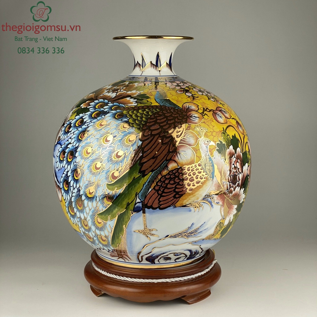 hình ảnh chim khổng tước, hoa mai, hoa cúc hòa hợp với nhau mang đến một hình ảnh thiên nhiên đa sắc màu. Và sản phẩm bình hút tài lộc công thành danh toại chắc chắn sẽ khiến những người chủ nhà khó tính nhất cũng phải hài lòng..