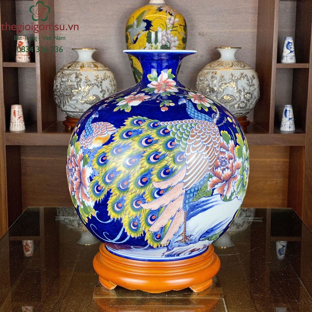 hình ảnh chim khổng tước, hoa mai, hoa cúc hòa hợp với nhau mang đến một hình ảnh thiên nhiên đa sắc màu. Và sản phẩm bình hút tài lộc công thành danh toại chắc chắn sẽ khiến những người chủ nhà khó tính nhất cũng phải hài lòng..