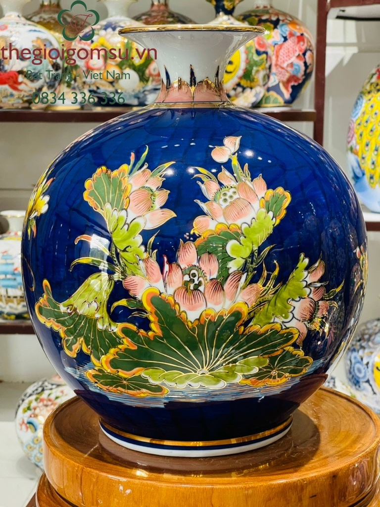 Bình hút Tài Lộc " Hoa Sen " vẽ vàng nền xanh coban