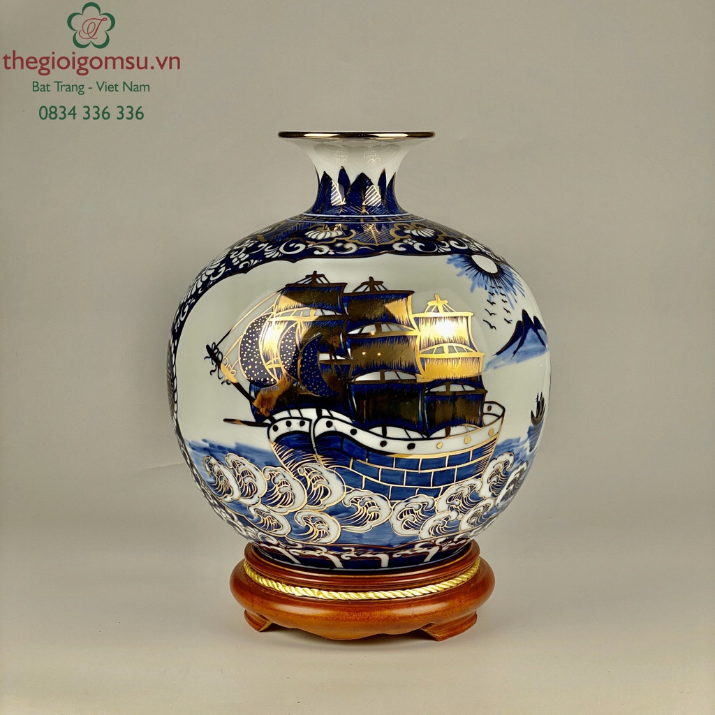 - Quy trình chế tác: Sản phẩm được chế tác thủ công 100% bởi bàn tay người nghệ nhân giỏi Bát Tràng. Trải qua lần nung đầu tiên ở nhiệt độ 1350 độ C và lần nung tiếp theo ở nhiệt độ 800 độ C để lớp vàng kim nóng chảy và bám chặt vào bề mặt sứ tạo nên vẻ đẹp sang quý, đẳng cấp.