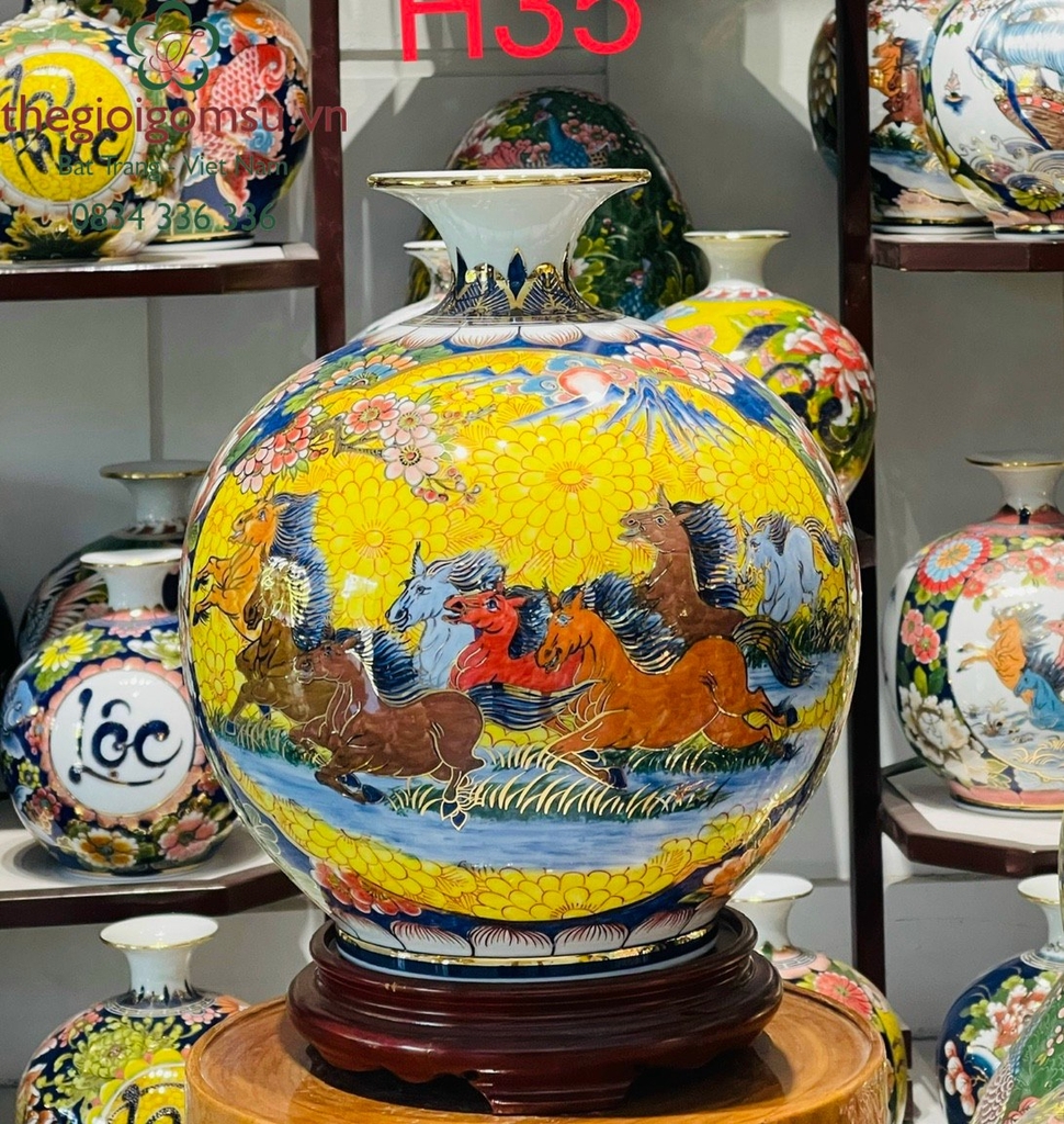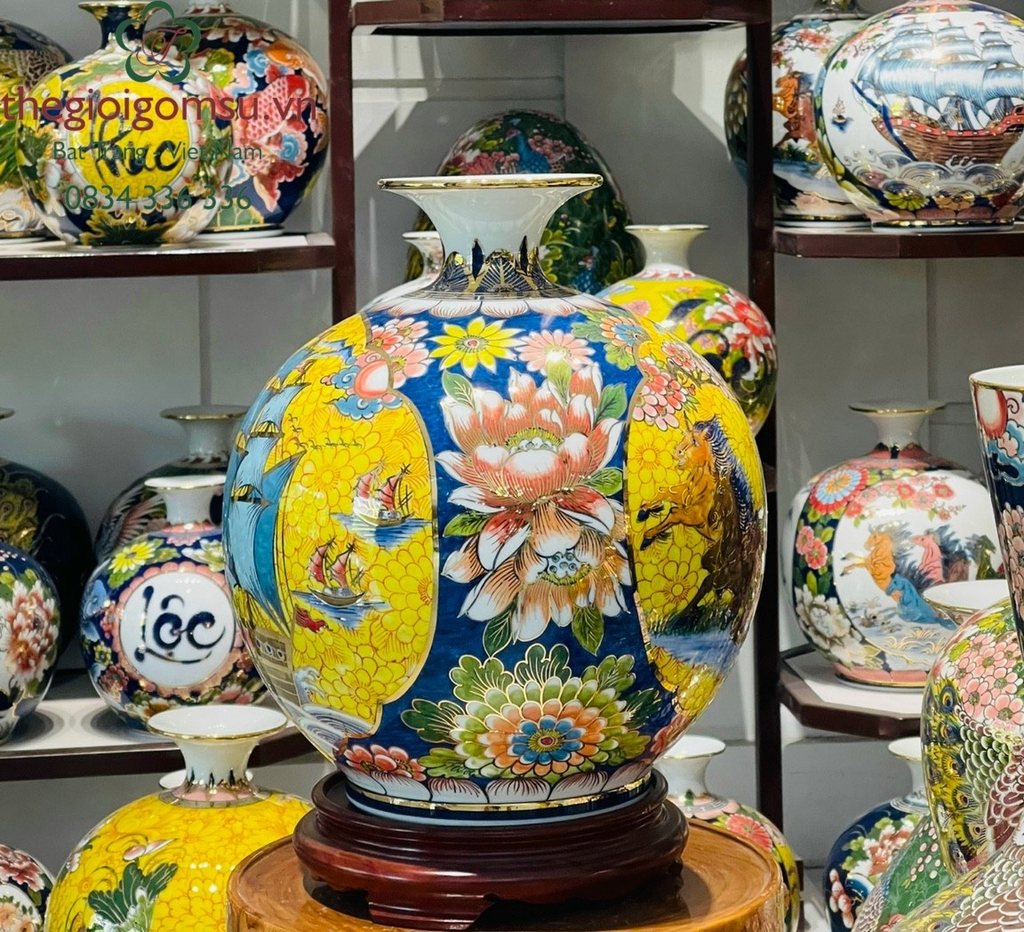 - Chất liệu: Bình hút tài lộc vẽ vàng 24k được tạo thành từ đất mẹ Đông Triều hòa cùng mạch nước thiêng sông Hồng cho cốt gốm dày dặn, cầm chắc tay, độ bền vượt trội.
