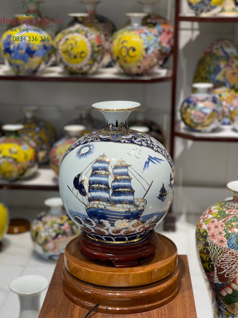 - Quy trình chế tác: Sản phẩm được chế tác thủ công 100% bởi bàn tay người nghệ nhân giỏi Bát Tràng. Trải qua lần nung đầu tiên ở nhiệt độ 1350 độ C và lần nung tiếp theo ở nhiệt độ 800 độ C để lớp vàng kim nóng chảy và bám chặt vào bề mặt sứ tạo nên vẻ đẹp sang quý, đẳng cấp.