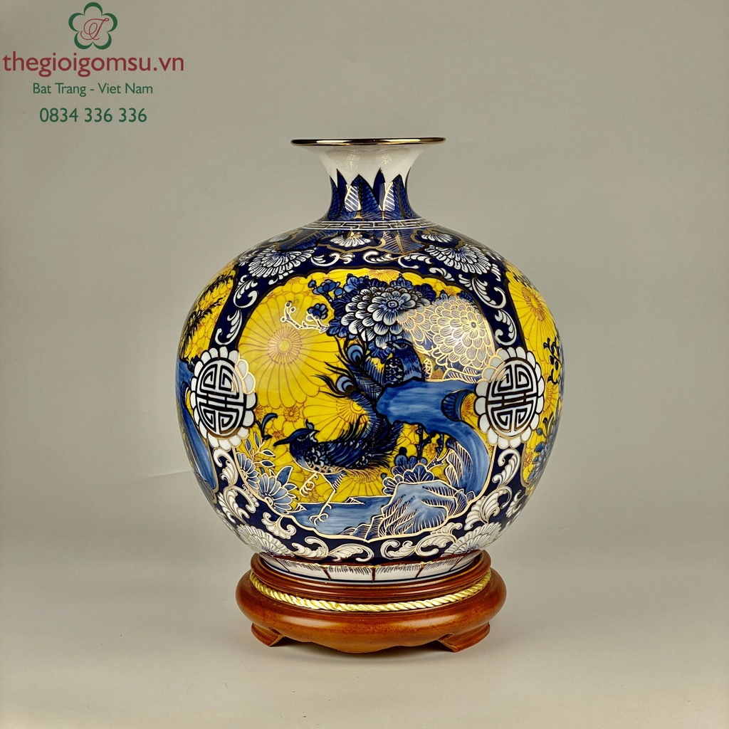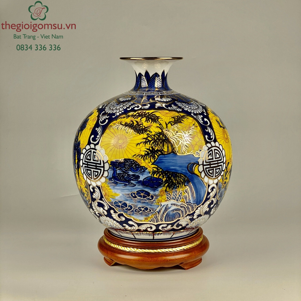 - Chất liệu: Bình hút tài lộc vẽ vàng 24k được tạo thành từ đất mẹ Đông Triều hòa cùng mạch nước thiêng sông Hồng cho cốt gốm dày dặn, cầm chắc tay, độ bền vượt trội.