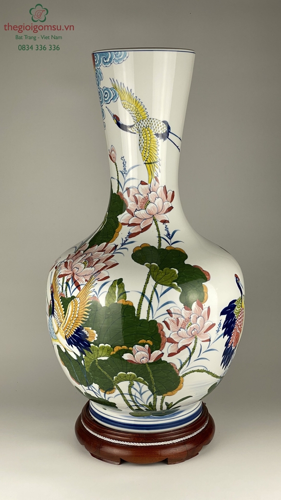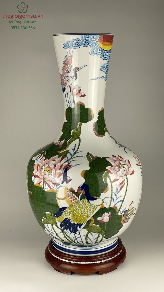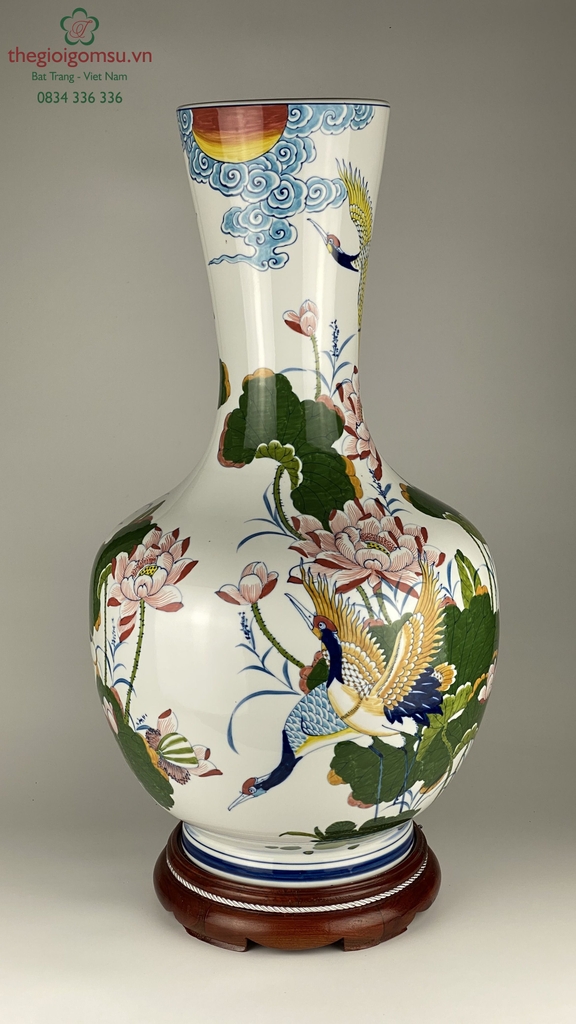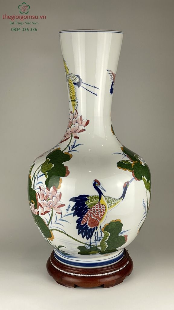 Bức tranh phong thủy Lọ lộc bình vẽ chim hạc hoa sen, biểu tượng cho trường thọ, vĩnh cửu.