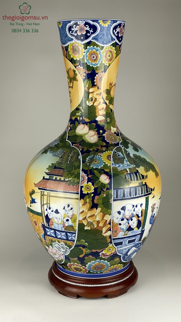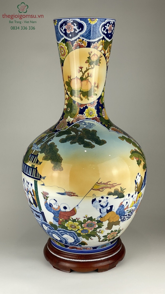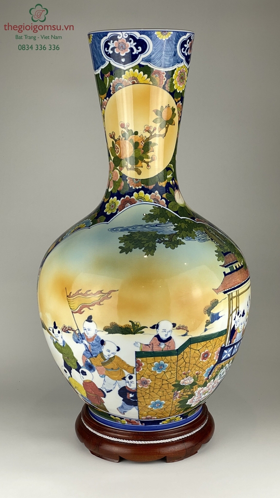 Trên nền gốm màu men Cổ – màu men quý, đặc trưng Bát Tràng được gìn giữ từ đời xưa, người dân làng gốm đã vẽ nên hình ảnh các em bé đang đùa vui, chơi các trò chơi dân gian như chơi cờ, đá cầu, chơi ô ăn quan,…trong không gian yên bình của làng quê Việt. Các em đang chơi các trò chơi – biểu trưng cho sự thông minh, năng động, tài trí, ham học hỏi ngay từ khi còn nhỏ. Phải chăng đó cũng là mơ ước con cháu học hành đỗ đạt sau này của người làm cha, làm mẹ gửi gắm vào trong sản phẩm gốm sứ Bát Tràng.