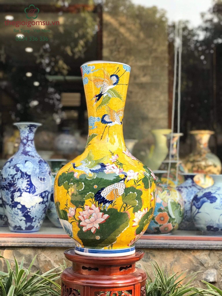 Bức tranh phong thủy Lọ lộc bình vẽ chim hạc hoa sen, biểu tượng cho trường thọ, vĩnh cửu.